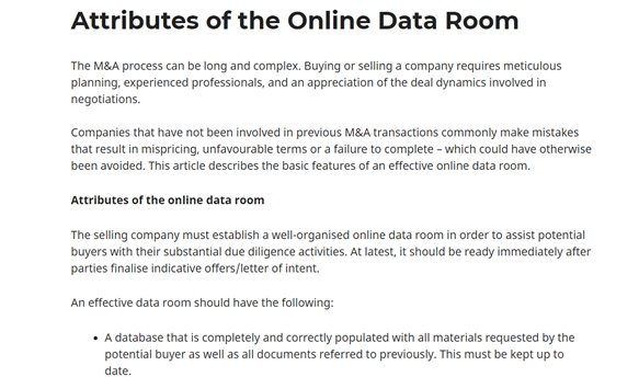 Companies that have not been involved in previous M&A transactions commonly make mistakes that result in mispricing, unfavourable terms or a failure to complete – which could have otherwise been avoided. This article describes the basic features of an effective online data room.